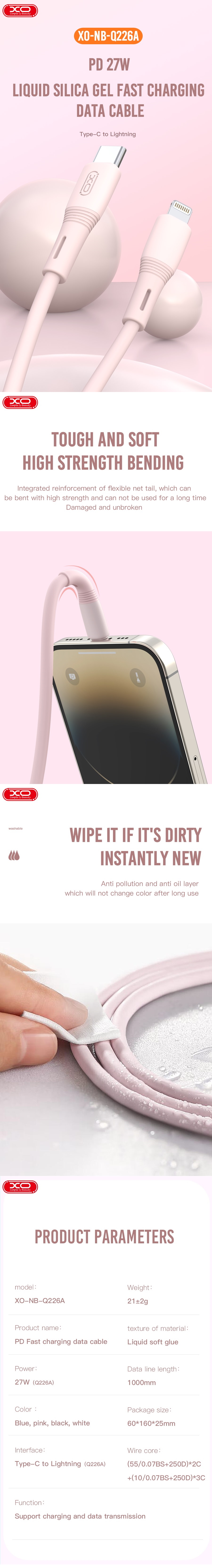 XO NB-Q226A PD is a cable equipped with USB-C and Lightning connectors. The cable has been designed to provide the greatest comfort for everyday use. The cable will allow you to fully use the maximum power with which compatible devices can be charged. Made of flexible silicone to ensure the longest possible use time.