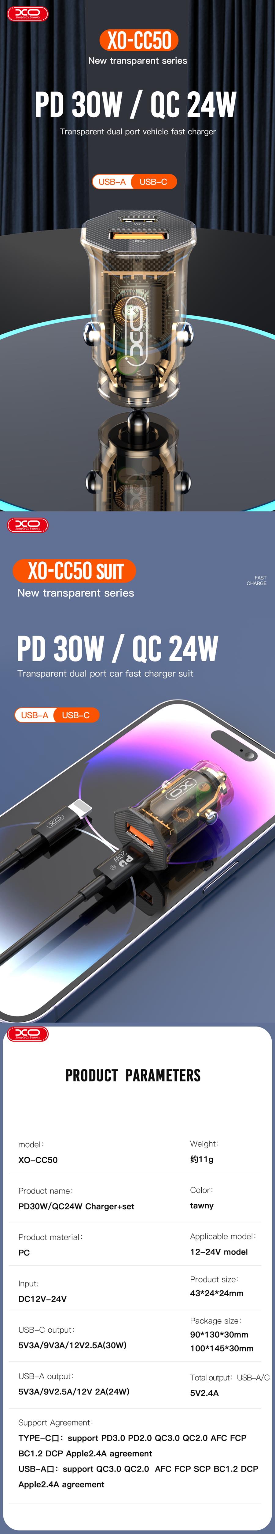 XO Clear a special line of accessories with transparent elements so that the user can admire the interior of the product. XO CC50 is a car charger with two USB A QC 3.0 / USB-C PD sockets and an additional USB-C - Lightning cable allows you to use it immediately after purchase. Thanks to the small dimensions of the charger, the device takes up little space. With the XO car charger, you no longer have to worry about an empty phone or tablet in the car.