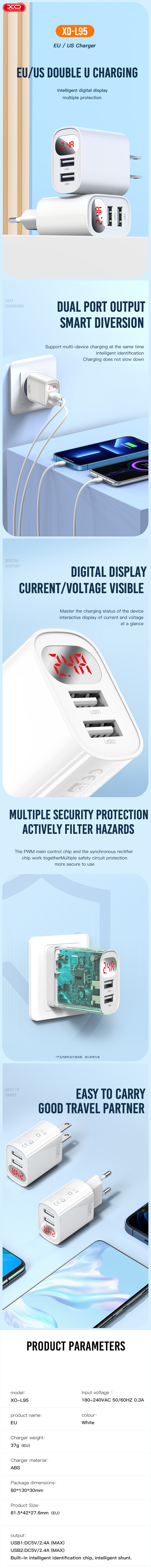 XO L95 to zaawansowana ładowarka sieciowa wyposażona w dwa gniazda USB A. Zapewnia wystarczającą ilość energii do szybkiego ładowania nawet największych dostępnych urządzeń mobilnych. Klasyczny wygląd pasuje do wszystkich rodzajów wnętrz a jakość wykonania wskazuje, że jest to urządzenie solidne i trwałe. Wyświetlacz pozwoli na kontrolowanie napięcia/ natężenia jakie jest przekazywane z ładowarki do urządzenia które ładujemy.