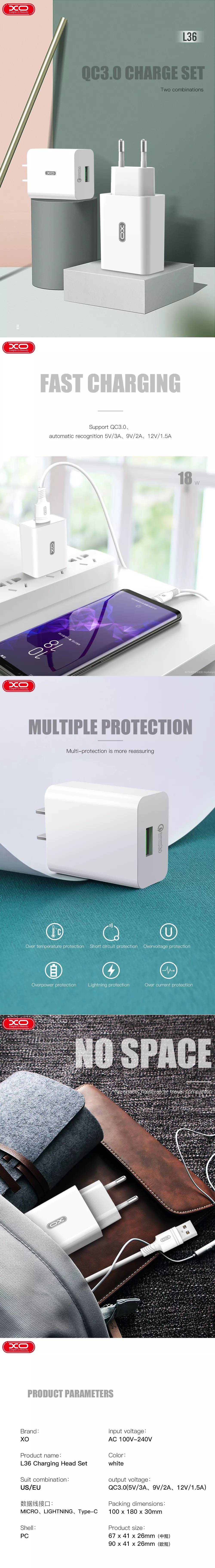 XO L36 to zaawansowana ładowarka sieciowa wyposażona w pojedyncze gniazdo USB z funkcją szybkiego ładowania QC 3.0. Zapewnia wystarczającą ilość energii do szybkiego ładowania nawet największych dostępnych urządzeń mobilnych. Klasyczny wygląd pasuje do wszystkich rodzajów wnętrz a jakość wykonania wskazuje, że jest to urządzenie solidne i trwałe.